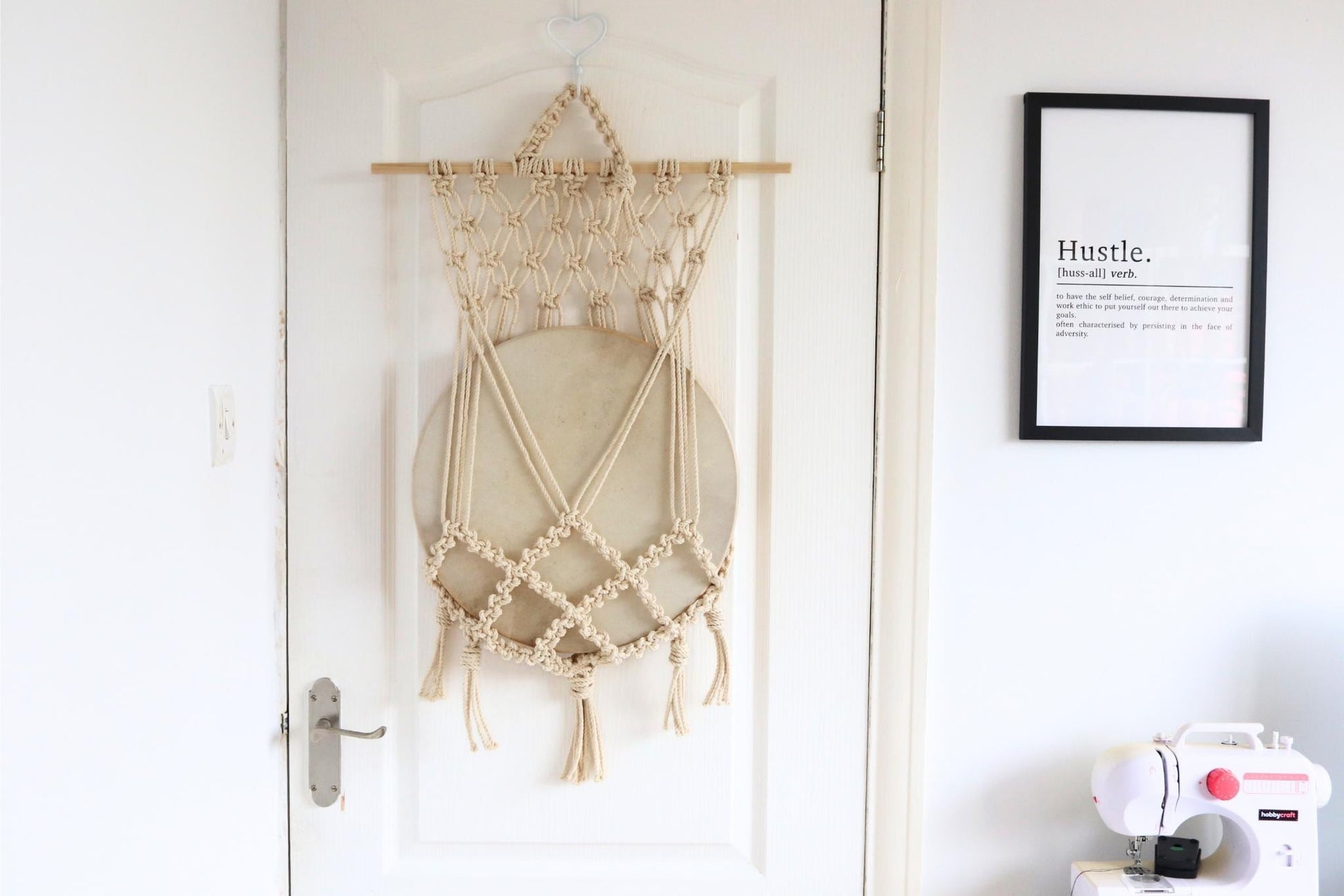 Each macrame instrument hanger is handmade at my home studio using my 4mm macrame high quality rope, you will also be given additional rope along the top so you can hang your hanger on your own wall hook.